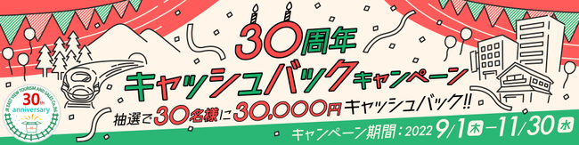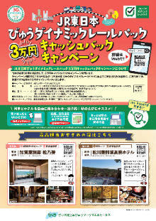 キャンペーン期間中に旅行代金合計が10万円以上となる「JR東日本びゅうダイナミックレールパック」でご出発されたお客さまへ、ご旅行終了後、抽選で30名様に3万円をキャッシュバックいたします。