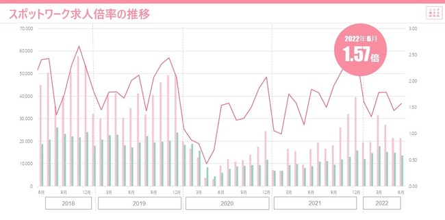 1.単発、短時間、短期間で働くスポットワークの2022年6月度求人倍率は1.57倍