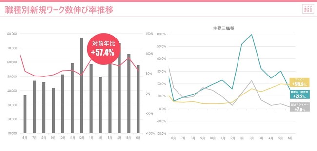 2.新規ワーク数は、対前年比で+57.4%。主要職種ではコンビニスタッフが+96.9%と伸長