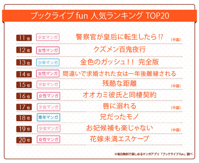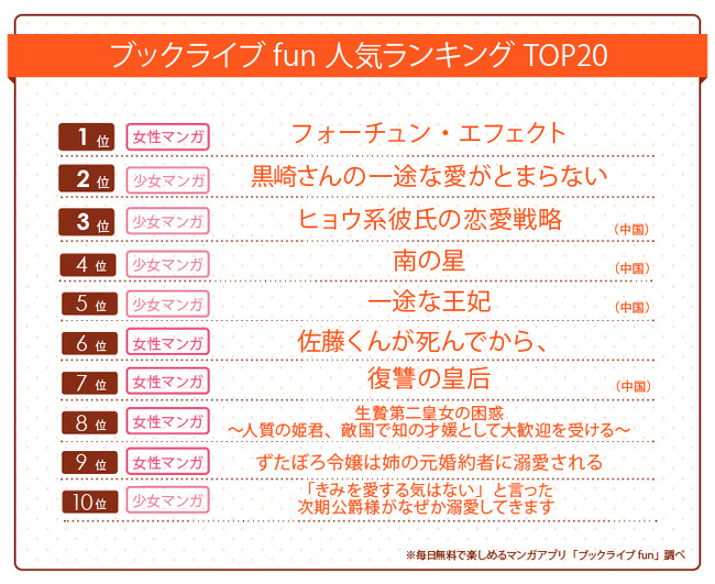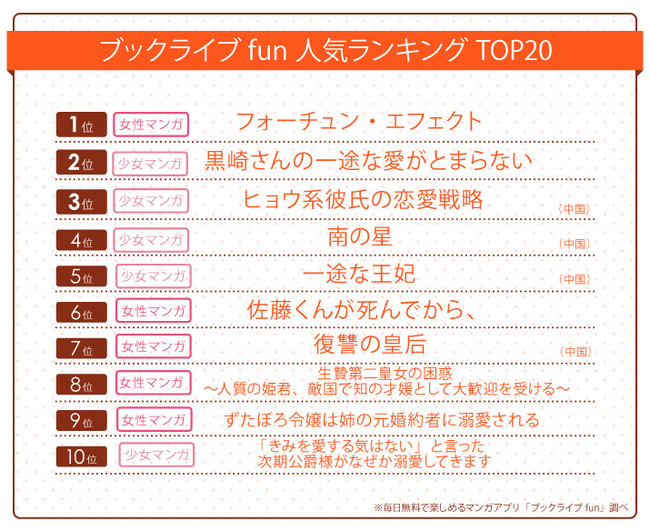 サービス開始より3ヶ月!国内外のマンガを楽しめる無料マンガアプリ「ブックライブ fun」、人気マンガランキング トップ20を発表
