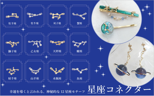 パーツ同士のつなぎに使用する、キュービックジルコニアがキラリと輝く星座モチーフのメタルデザインパーツが登場。12星座がそろっています。