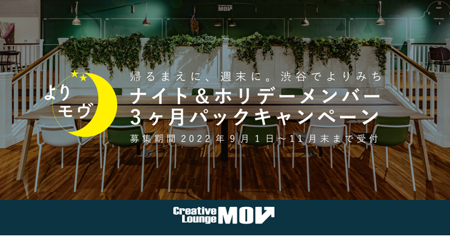 渋谷ヒカリエのメンバー制コワーキングスペースCreative Lounge MOV(本社:大阪市/社長:黒田 英邦)は、2022年9月1日(木)~2022年11月30日(水)まで、【ナイト&ホリデーメンバー3ヶ月パックキャンペーン】を開催します。