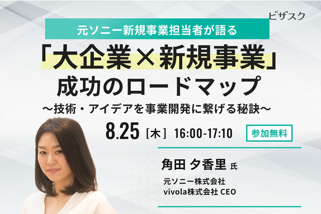 「知見と、挑戦をつなぐ」をミッションにグローバルなナレッジプラットフォームを運営する株式会社ビザスク(以下、当社)は、「大企業×新規事業 成功のロードマップ」をテーマに、元ソニー株式会社で現在vivola株式会社 CEOの角田 夕香里氏のご登壇による無料オンラインセミナーを、8/25(木)16時より開催します。