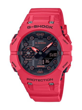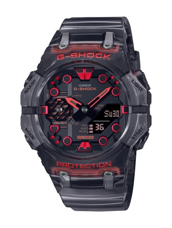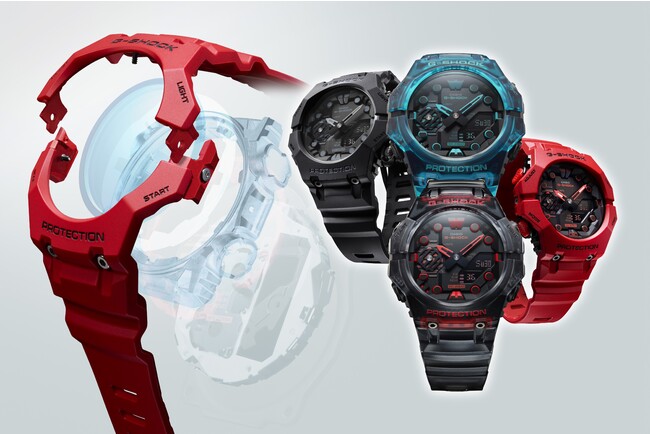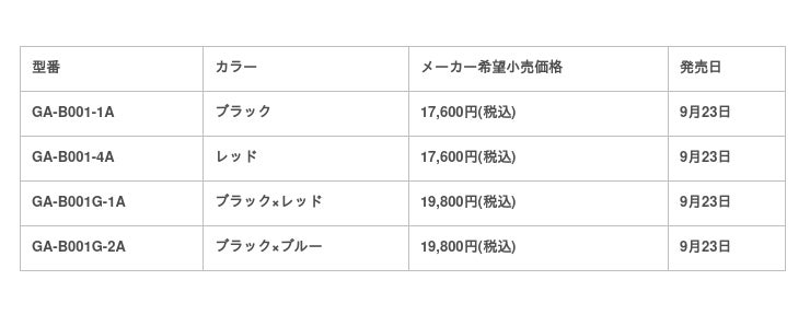 カラーリングは、“G-SHOCK”のブランドカラーであるブラックと新色のレッドを採用した『GA-B001』と、スケルトン素材のベゼルとバンドにグラデーション印刷を施した『GA-B001G』をラインアップしています。