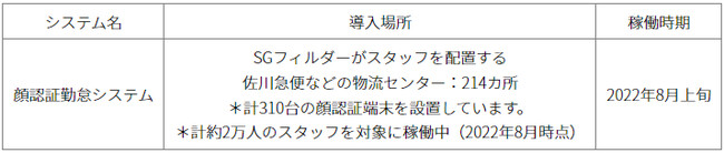 SGシステム株式会社(以下、SGシステム)、シャープマーケティングジャパン株式会社(以下、シャープマーケティングジャパン)および株式会社データスコープ(以下、データスコープ)は、SGフィルダー株式会社(以下、SGフィルダー)の協力のもと「顔認証勤怠システム」を共同で開発しました。佐川急便株式会社(以下、佐川急便)などの物流センター214カ所に導入し、本年8月上旬に本稼働を開始しました。