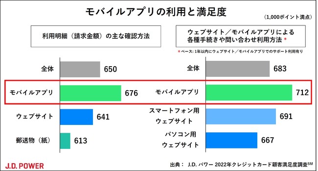 利用明細(請求金額)の主な確認方法別に総合満足度を見ると、「モバイルアプリ」が最も高く(676ポイント)、「ウェブサイト(パソコン用・スマートフォン用ホームページ)」(641ポイント)や「郵送物(紙)」(613ポイント)を大きく上回っている。