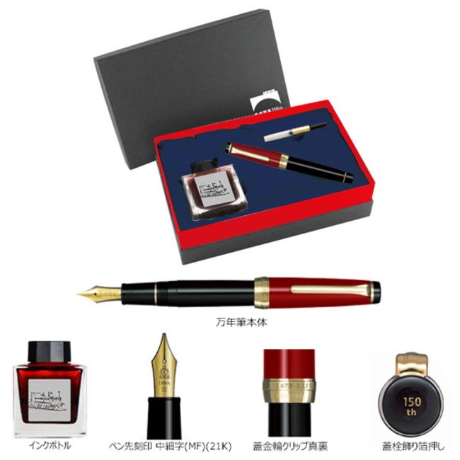 創業110年以上と歴史あるセーラー万年筆株式会社と製作、開業当時に走行していた1号機関車(150形)デザインや限定150本を記すシリアルナンバーが刻まれた鉄道開業150年記念オリジナル限定万年筆です。