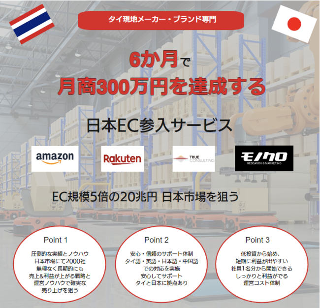 そこでトゥルーコンサルティング株式会社と株式会社モノクロはタイ現地メーカー様向けに日本Amazon進出の支援サービスを開始します。