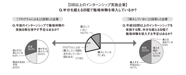5日間以上のインターンシップを実施している企業は、7割以上が「半数を超える日程」で職場体験を導入。導入していない企業も、導入に前向き/インターンシップに関するルール変更を受けアンケートを実施