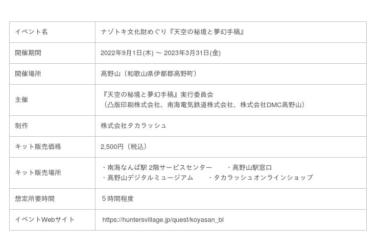 凸版印刷株式会社(本社:東京都文京区、代表取締役社長:麿 秀晴、以下 凸版印刷)、南海電気鉄道株式会社(本社:大阪市浪速区、代表取締役社長:遠北 光彦、以下 南海電鉄)と株式会社DMC高野山(本社:和歌山県高野町、代表取締役:大田原博亮、以下 DMC高野山)は、2022年9月1日(木)から2023年3月31日(金)まで、世界遺産・高野山を舞台とする謎解きイベント「ナゾトキ文化財めぐり『天空の秘境と夢幻手稿(むげんしゅこう)』」を開催します。