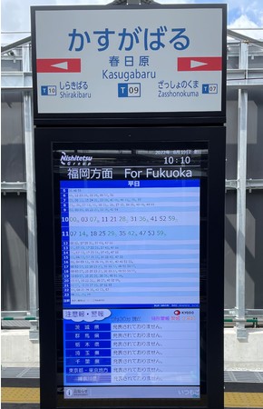 西鉄電車での「MMvision」導入は今回が初めてとなり、春日原駅の上下線ホーム(各ホーム2基、計4基)に設置いたします。お客さまの見やすさに配慮した時刻表および豊富な情報発信で、駅サービスの向上を目指します。