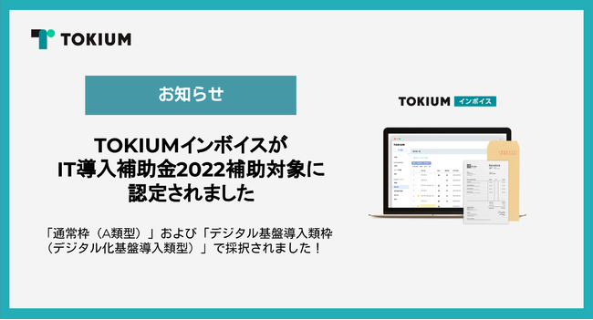 株式会社TOKIUM(本社:東京都千代田区、代表取締役:黒崎賢一、以下「当社」)は、この度、経済産業省 中小企業庁が推進する「IT導入補助金2022」(以下、IT導入補助金)通常枠およびデジタル基盤導入類枠において「IT導入支援事業者」として認定され、当社の提供する請求書受領クラウド【TOKIUMインボイス】が対象ITツールとして採択されたことをお知らせいたします。