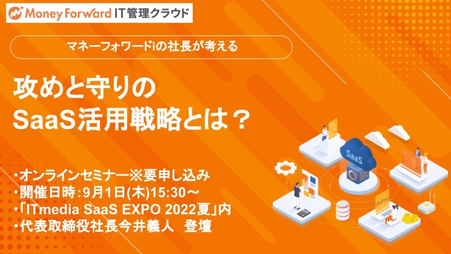 SaaS管理プラットフォーム『マネーフォワード IT管理クラウド』を提供するマネーフォワードi株式会社は、2022年9月1日(木) 「ITmedia SaaS EXPO 2022夏」内で行われる経営者向けのセミナー「マネーフォワードiの社長が考える、攻めと守りのSaaS活用戦略とは?」に登壇します。