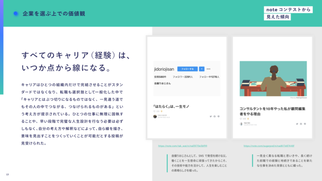 仕事や生き方が多様になり、人生の選択も自由にできるように社会が変化するとともに、仕事選びの軸にも変化が起きています。人や社会にどのような影響を与えたいかを考えている方、自分が大切にしている価値観を尊重して意思決定した方のエピソードに共感が集まりました。