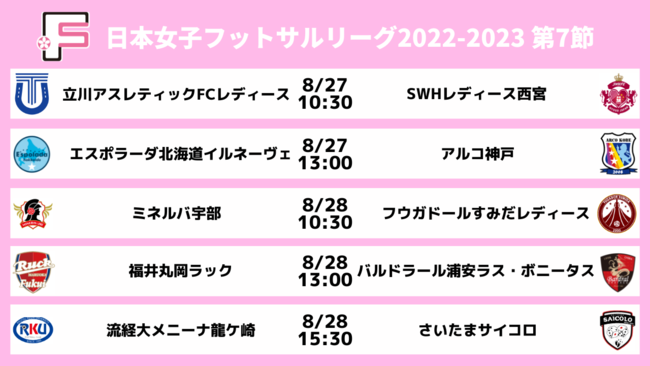 8月27日(土)、28日(日)の2日間、北海きたえーるにて日本女子フットサルリーグ2022-2023 第7節を開催します。今シーズンもSPOTV NOW(登録・視聴無料)にて全試合をライブ配信いたしますので、ぜひご視聴ください!
