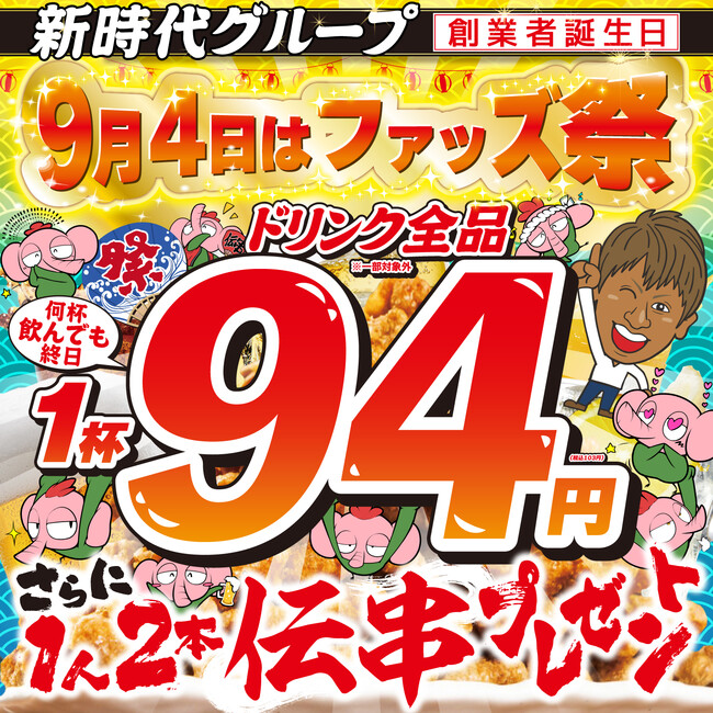 9月4日(串の日)、新時代グループ創業者の誕生日にファッズ祭開催!【名物の“伝串”を1人2本プレンゼント&ドリンク全品94円】