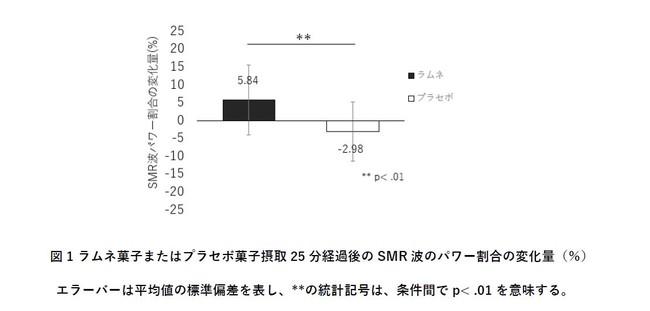 ラムネ摂取条件では、プラセボ摂取条件よりも認知機能テストのスコアが有意に改善したため、ラムネ摂取は「情報処理速度」や「持続的注意力」の向上に有用であることが改めて確認されました。また、ゲーム開始25分後において、様々な周波数帯の脳波データを解析したところ、特にラムネ摂取条件の方がSMR波のパワー割合が有意に高かったことから、ラムネ摂取は、時間の経過を忘れるほど課題に没頭している状態、いわゆるフロー状態をもたらす可能性が示されました(図1)。フロー状態については、プロのアスリートやアーティストに限らず全ての人間に共通する感覚で、いわゆる「ゾーン」に入っているとも表現されています4)。