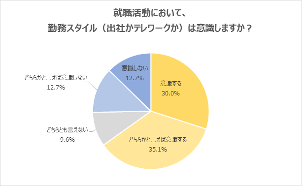 就職活動において、「勤務スタイル(出社かテレワークか)」を「意識する」回答した学生が30.0%に上りました。「どちらかと言えば意識する」の回答(35.1%)を合わせると、65.1%が、就職活動において勤務スタイルを意識していることが分かります。「働き方の選択肢が多い企業は魅力を感じる」「入社後は仕事を覚えるために出社したいので、出社の機会があるかを意識している」「長く働ける企業に入社したいので、子育てをすることも見据えてテレワーク制度の有無は確認するようにしている」「育児や介護など、何か事情があるときにテレワークができる環境があるかは意識している」などの声が寄せられました。
