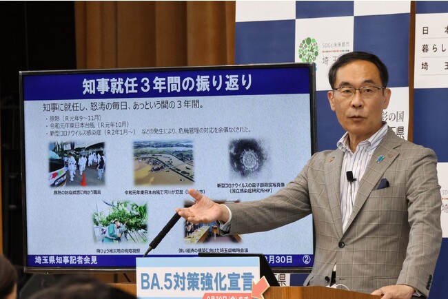 私が埼玉県知事に就任して、明日(8月31日)で4年目を迎えることとなります。これまでの3年間を振り返り、知事に就任して以来、豚熱、令和元年東日本台風、新型コロナウイルス感染症が立て続けに発生しました。直近では、降ひょうや集中豪雨による被害、さらには原油価格や物価の高騰への対応も求められました。危機対応に追われ、「自分がやりたいこと」よりも「やらなければいけないこと」を優先せざるを得なかった3年間というのが率直な感想であります。そういった中にあっても、「日本一暮らしやすい埼玉」の実現に向け、各施策に取り組んでまいりました。 現在、新型コロナ対策を最優先で取り組まなければならないと考えていますが、その一方で4月にスタートした5か年計画に基づき、県政全般について私がしっかりと指揮をとることで、734万県民の期待に応えていきたいと考えております。