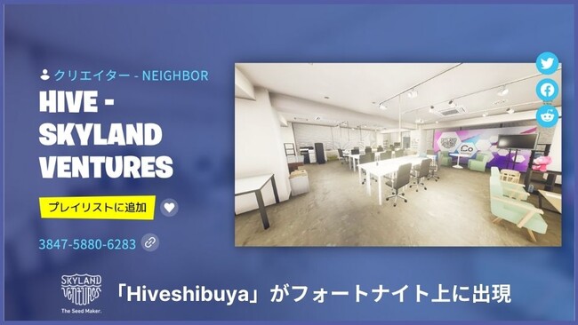 Skyland Venturesが共同運営するコワーキングスペース 「Hiveshibuya」がフォートナイト上に出現