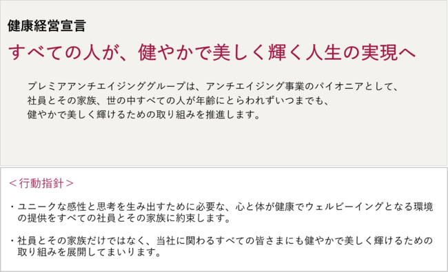 プレミアアンチエイジング株式会社(本社:東京都港区、代表取締役社長:松浦 清、以下「当社」)は、アンチエイジング事業におけるリーディングカンパニーを目指す会社として、2022年8月17日にプレミアアンチエイジング健康経営宣言を策定いたしました。