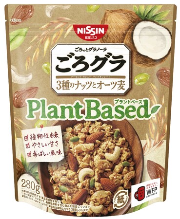 そこで今回、“気軽に毎日続けられるプラントベース朝食”をコンセプトに開発した、「ごろグラ」ブランド史上初となるプラントベース(*2)の新商品「ごろグラ Plant Based 3種のナッツとオーツ麦 280g」を発売します。オーツ麦、スライスアーモンド、ココナッツチップを合わせたシリアル生地に、まるごとアーモンド、カシューナッツ、パンプキンシードをブレンドした、やさしい甘さと香ばしい風味が特長です。パッケージには、環境にやさしい紙包材とバイオマスインキを使用しているほか、途上国の子どもたちに学校給食を支援する国連WFPの「レッドカップキャンペーン」に参加するなど、カラダだけでなく、社会や地球環境にも配慮しています。