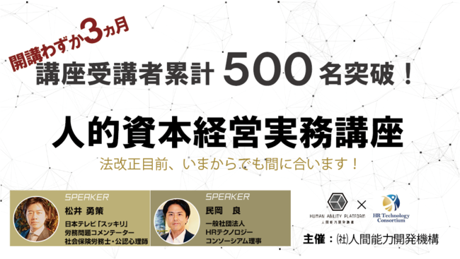 人的資本経営を推進する団体「一般社団法人 Human Ability Platform人間能力開発機構」主催、企業の人的資本経営開示の支援者育成セミナー『人的資本経営実務講座』が開講3ヵ月で500名を突破いたしました。