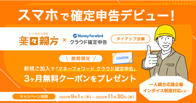 株式会社マネーフォワード(以下「当社」)は、2022年9月1日より一般社団法人Sen あんぜん労災一人親方建設協会が運営するネット型労災保険『楽々親方』と、一人親方応援タイアップ企画を開始しました。2022年9月1日(木)~2022年11月30日(水)の期間中に『楽々親方』の新規ご加入で『マネーフォワード クラウド確定申告』の3ヶ月無料クーポンをプレゼントします。