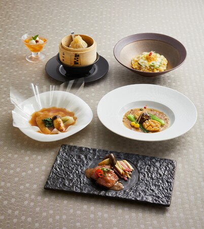 魚介料理は、帆立貝の食感の良さを引き出すように軽く炙り、トロっと甘い西洋ネギを合わせて、ポルチーニ茸のソースで濃厚な味わいと芳醇な香りに仕上げました。また、肉料理は、和牛のローストを、風味豊かなXO醤ソースで、黄ニラ、マコモダケ、紅芯大根などの彩り鮮やかな野菜のソテーとともにお楽しみいただけます。