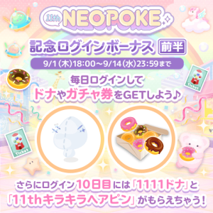 期間中に10日間ログインすることで「ドナ」や「ガチャ券」などのアイテムを獲得することができます。なお、ログインボーナスイベントは2回実施されます。前半の10日目のログインでは「1111ドナ」と「11thキラキラヘアピン」、後半では「1111ドナ」と「11thハートマスク」のアイテムをプレゼントします。