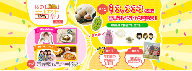 キャンペーン期間中にヨシケイのミールキットをご購入いただくと、抽選で3,333名様に8,000円相当の食材や調理道具、家電などが選べる「カタログギフト」のプレゼント。または、コラボメニューの発売を記念して、Mizukiさん、3時のヒロインそれぞれにちなんだグッズを65名様にプレゼントします。