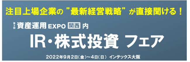 日本最大の見本市主催会社RX Japan(株)は2022年9月2日(金)~4日(日)の3日間、第3回 資産運用EXPO【関西】にて「IR・株式投資フェア」を開催します。(会場:インテックス大阪)