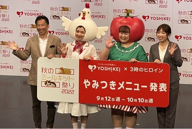 つくる人から笑顔に。をテーマに全国でミールキット宅配サービスを提供するヨシケイグループ(本部所在地:静岡県静岡市 / 代表取締役:井野口 雄一)は、「ヨシケイ 秋のミールキット祭り 2022」の概要説明、ならびに吉本興業所属のタレント・3時のヒロインと共同開発したミールキットの発表記者会見を9月1日(木)11時より東京・渋谷のヨシモト∞ホールにて行いました。