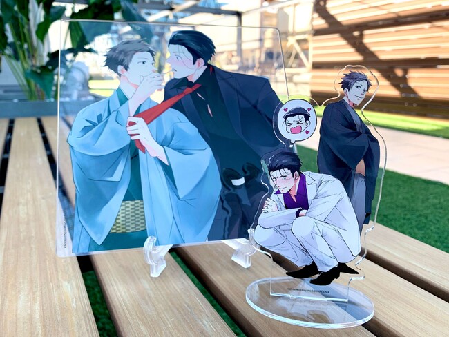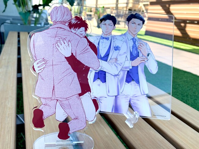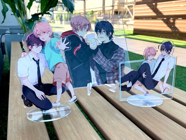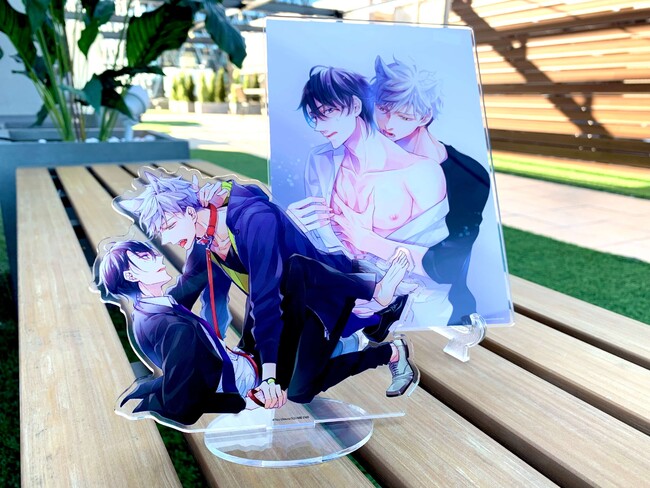 また、アクリルアートボードは付属の台座を付けると立てて飾れます。表紙や作品コマが描かれたグッズから推しカプの萌えを享受しましょう……!