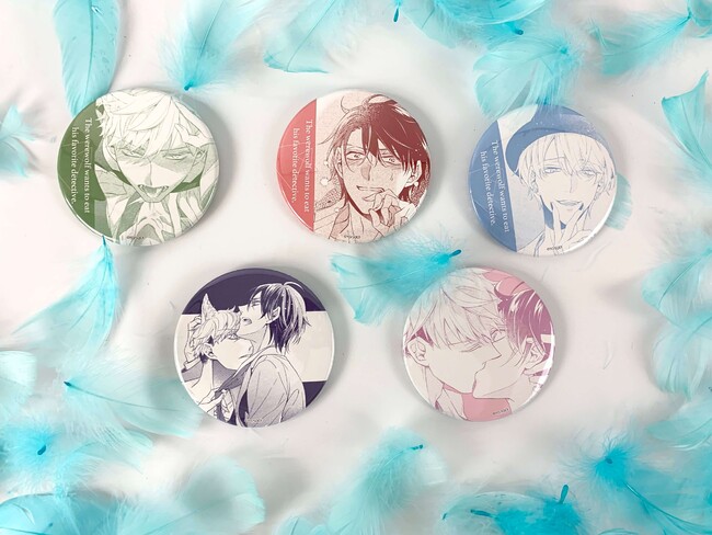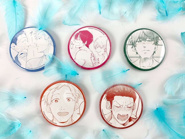『恋する極道おにいさん』『オオカミは探偵を食べたい』『俺の花婿はお前じゃない』の3作品がデザインされた缶バッジとアクリルキーホルダーが新登場。