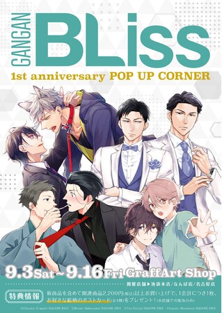 BLコミックレーベル『ガンガンBLiss』は9月1日で創刊1周年を迎えます。1周年を記念し、GraffArt Shop池袋本店・なんば店・名古屋店にてPOP UPコーナーの開催が決定!