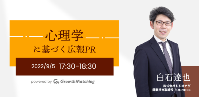 【決裁者限定の成長支援プラットフォーム「GrowthMatching」】担当者が抑えておきたいPRの基礎知識-心理学に基づいた広報PR セミナー 9月5日(月)17:30~開催