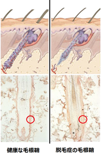 健康な頭皮では毛包は皮膚の深い部分に根付いていますが、脱毛症の頭皮では毛包の位置は浅く、毛包周囲の鞘組織が肥大し(図1:右下の写真赤丸部分)、また毛髪が細くなっていることが観察されます。このことから、コラーゲン代謝の不具合によって毛包周囲の鞘組織にコラーゲンが沈着し、鞘が肥大することによって、毛細血管から十分な酸素や栄養が与えられていないことが脱毛の一因ではないかと考えました。
