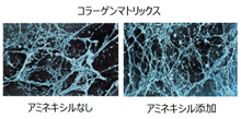 ピリミジンN-オキシドがリジルオキシダーゼの活性を抑制することはよく知られていますが、血圧降下性(血管拡張性)を示すことが化粧品の原料としては問題でした。そこで、ピリミジン N-オキシドの誘導体を150個以上合成し、リジルオキシダーゼの活性を有効に抑制し、かつ血圧降下性を示さない分子、ジアミノピリミジンオキシド(2,4-diamino-pyrimidine N-oxide、アミネキシル)を選択しました。アミネキシルはリジルオキシダーゼの活性だけではなく、この酵素の発現をmRNAレベルで抑制することが分かりました。また、この分子は線維芽細胞が生産するコラーゲンのマトリックス形態を整え、コラーゲン繊維の凝集を防ぐことも示されました(図2)。