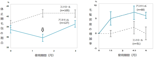 さらに、中程度の脱毛が認められる男性232名において使用テストを行ったところ、アミネキシルを含むフォーミュレーションを使用した群(n=127)では3か月後には休止期の毛包の割合がコントロールのフォーミュレーションを使用した群(n=105)に比べ、有意に低減していました(図3:左グラフ)。また、使用1.5か月後は休止期の毛包が季節的に増加する時期にもかかわらず、その割合が減少したことが観察されました(図3左グラフ、矢印)。