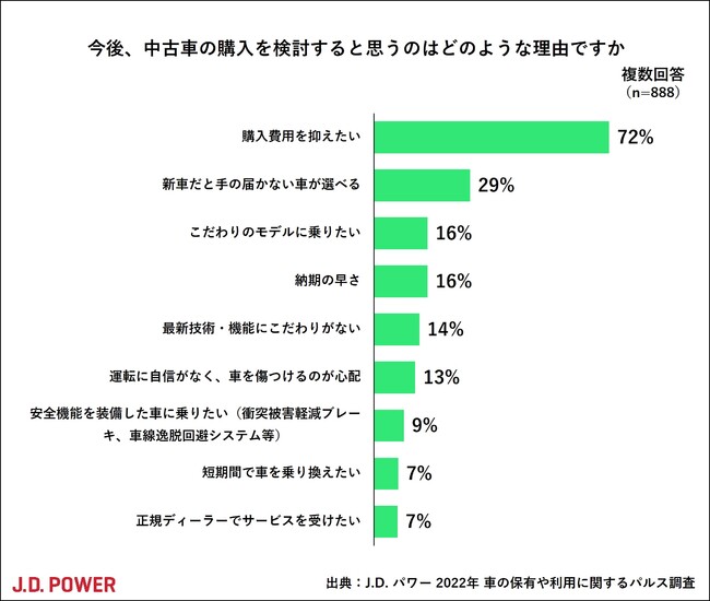 中古車購入の検討理由として、ダントツで「購入費用を抑えたい」(72%)が最も多く、次いで「新車だと手の届かない車が選べる」(29%)、「こだわりのモデルに乗りたい」「納期の早さ」(共に16%)という結果となりました。
