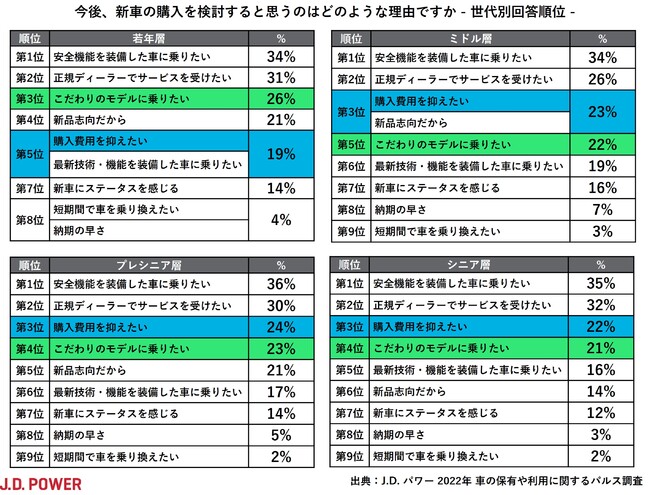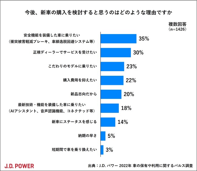 新車購入の検討理由トップ2は、「安全機能を装備した車に乗りたい」、「正規ディーラーでサービスを受けたい」