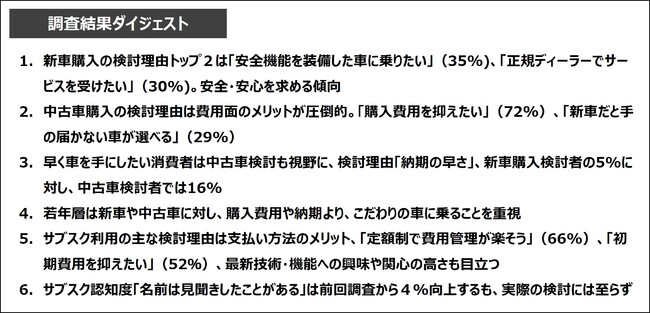 新車購入の主な検討理由は安全装備、サブスク派は最新技術への関心を重視、納期問題と中古車