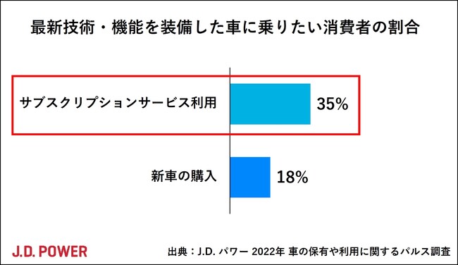 「最新技術・機能を装備した車に乗りたい」の35%は、新車購入派の18%よりも17ポイントも高く、サブスク派の先進技術や機能への関心の高さを示しています。