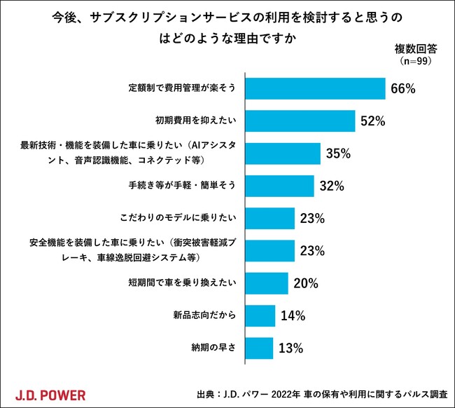 費用面でのメリットを理由に挙げる人が多い一方、「車を短期間で乗り換えたい」というニーズも、サブスク利用に関しては20%と、新車購入(3%)や中古車購入(7%)と比べて高いこともわかりました。