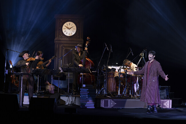 初日の東京公演。オープニングでは、大時計や天体望遠鏡、本棚などが置かれた不思議な雰囲気の中、本棚の魔導書が光り、ひとりでに開いて、謎めいたスモークが空間に漂う。すると、本の世界の登場人物たちである古澤ら演奏者たちが登場し、謎めいた魅惑的な雰囲気のまま1曲目の「What can we do?」を奏でる。