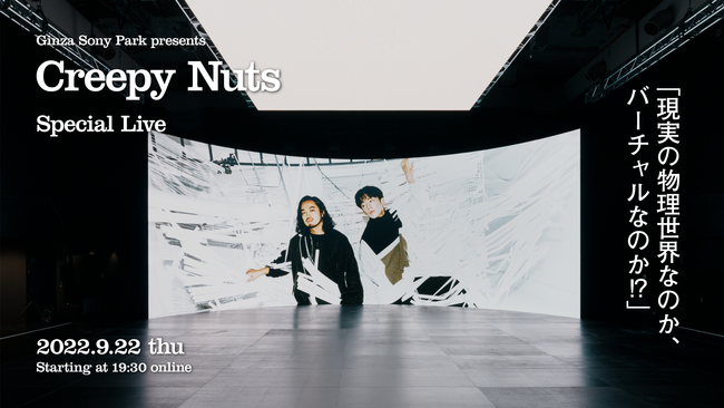 「クリエイティビティとテクノロジーの力で、世界を感動で満たす」というソニーのPurpose (存在意義)のもと、「場」を使った新たなクリエイティブを生み出す実験的な活動を続けてきたGinza Sony Park(銀座ソニーパーク)。今回、ソニーグループとして初めての試みとなる先端映像技術「バーチャルプロダクション(※)」を活用した”実験的”音楽ライブ配信イベントを、ヒップホップ・ユニットのCreepy Nutsと共に開催します。