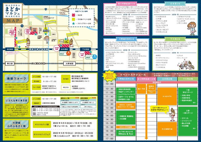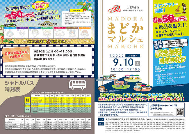 また、まどかマルシェ当日は、西鉄電車記念無料乗車券を発行します。下大利駅・白木原駅・春日原駅で配布される記念乗車券を駅窓口でご提示いただくと、9月10日(土)9:00~18:00は、西鉄電車下大利駅・白木原駅・春日原駅間は無料でご乗車いただけます。(9:00以降に入場、18:00までに出場されたお客さま対象です。)