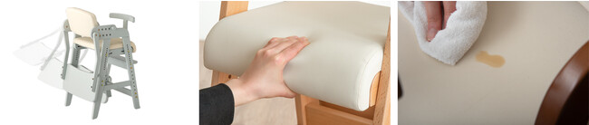 製品付属のテーブルは必要な時だけ、前へ回して使用することができ、それ以外は後ろへ回して邪魔にならないようにすることができます。もちろん、お子さまが大きくなり、テーブル自体が必要なくなると、チェアから取り外すこともできます。さらに、座面と背もたれはウレタンフォームを中材に使用しているので、座面の厚みは約9cm、背もたれの厚みは約3cmとふっくら座り心地の良いクッションを搭載しています。座面と背もたれのカバー生地は、どちらもPVCレザー製です。飲み物や食べ物をこぼしてしまった際、さっと拭くだけで済み、お手入れの簡単さも魅力の一つです。