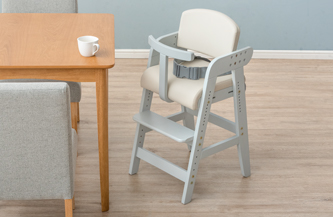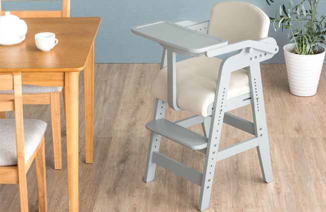 お子さまが、幼い時期はベビーチェアとしてダイニングテーブル等合わせて使用できるのはもちろん、成長に合わせて学習机用の椅子としても使えるように、子どもっぽくない、シンプルなデザインになっているのも本製品の特長です。
